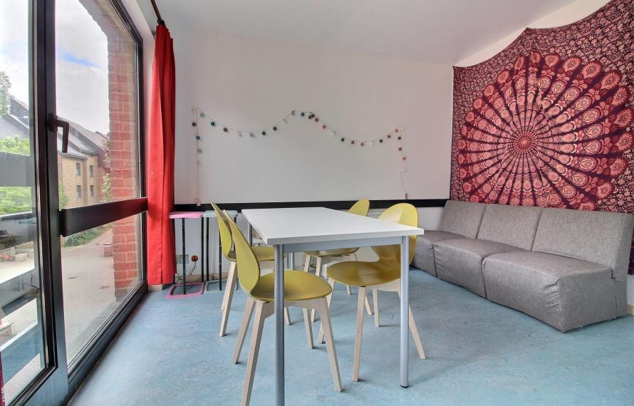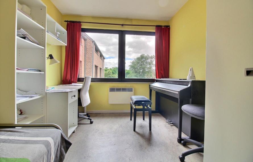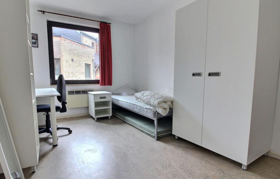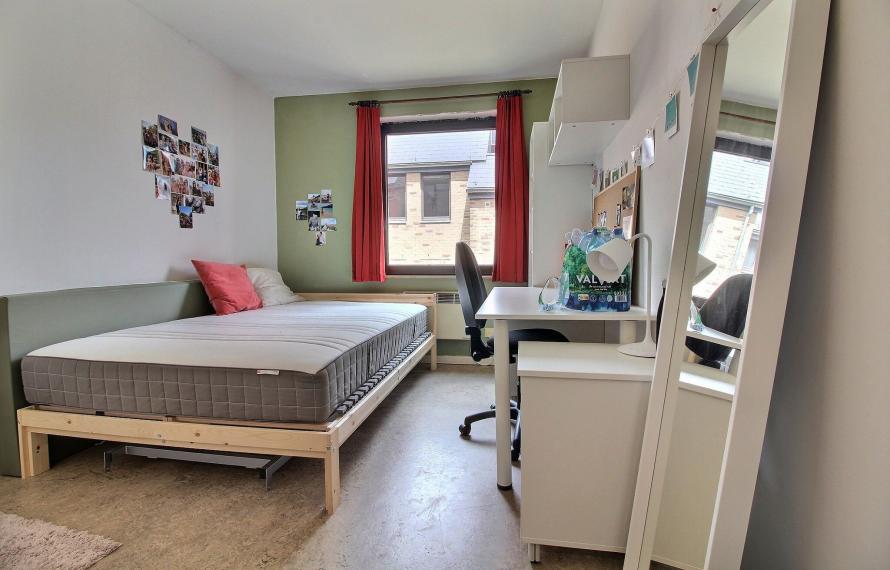 Chambre meublée d'environ 12m² dans un communautaire de 3 à 6 pers. au sein d'un immeuble construit dans les années 90 au coeur du quartier des Bruyères proche du lac de Louvain-la-Neuve.