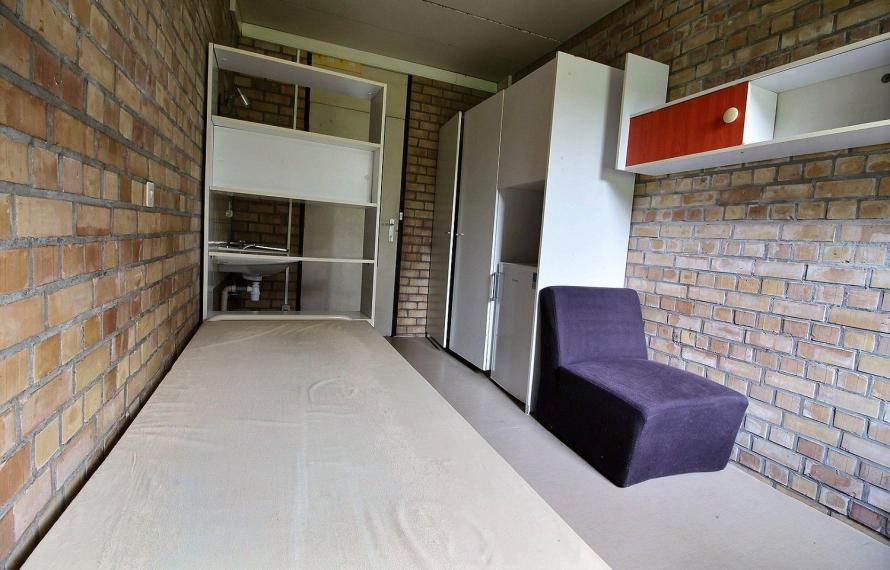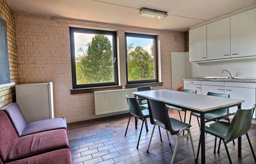 - Communautaire composé d'un séjour et d'une cuisine équipée de +/- 20m² (taques électriques, hotte, frigo, four), d'une douche, d'un WC séparé et d'une prise TV.