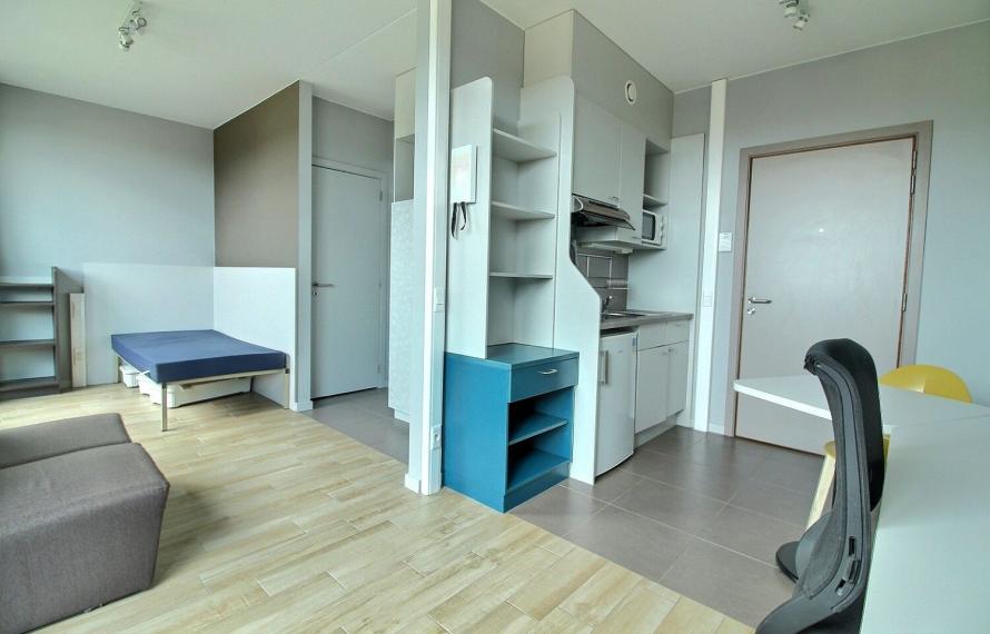 - Il se compose d'un séjour avec carrelage imitation parquet au sol, d'un coin lit et bureau avec rangements, d'une cuisine carrelée équipée (2 taques de cuisson + hotte + frigo + micro-ondes), d'une salle de douche carrelée avec meuble lavabo/miroir et WC, de prises TV/Internet (connexion individuelle haut débit par fibre optique)